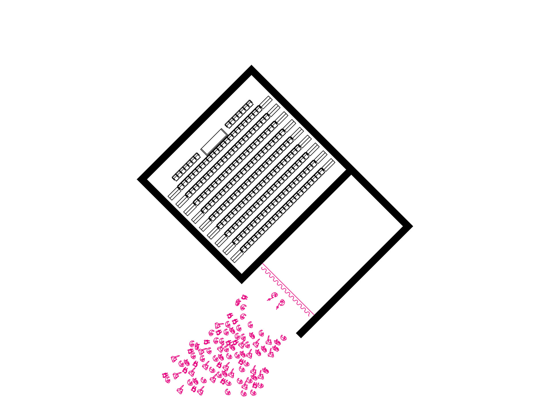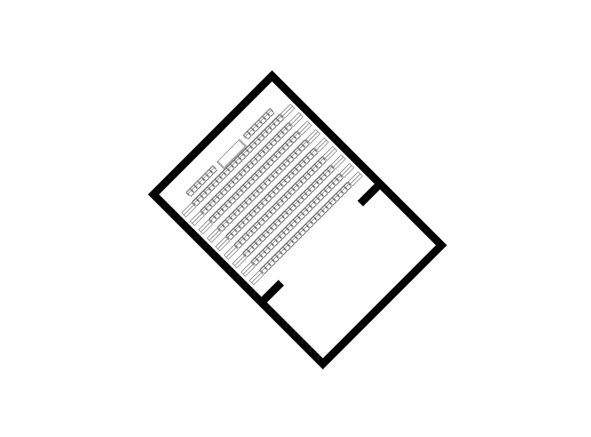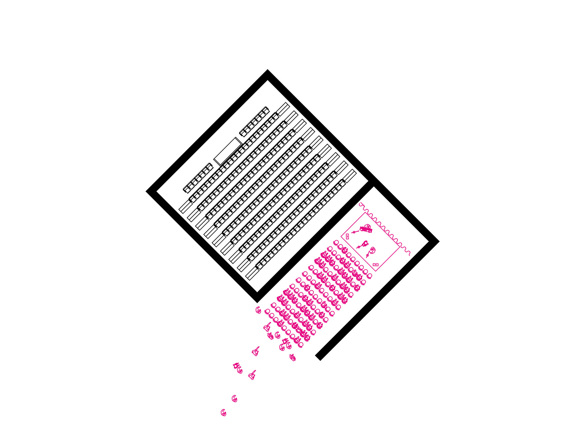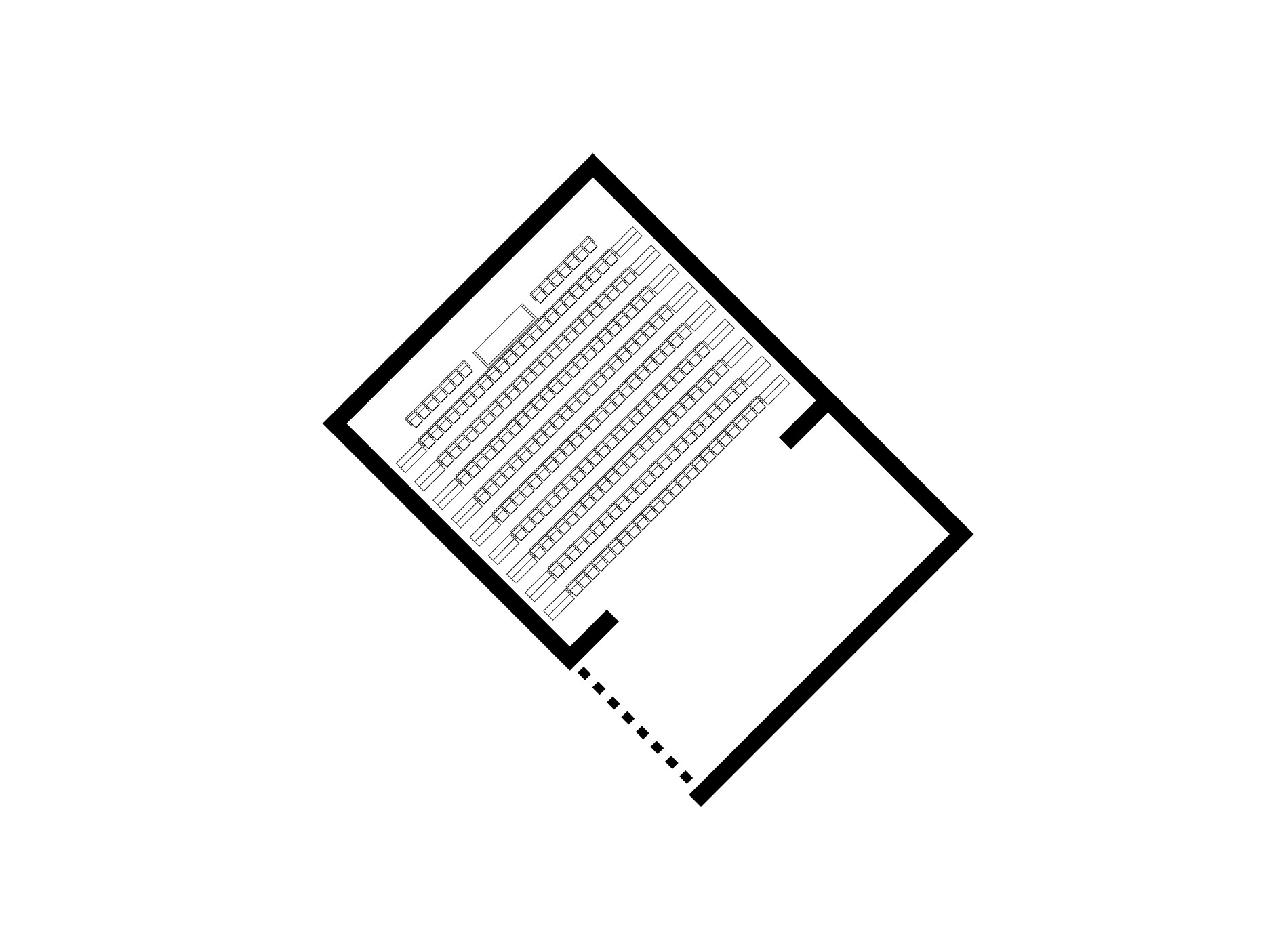 The proposal is that the new auditorium be a continuity of the existing public space. The west side of the stage is separated from the outside of the building by a large gate that can completely open to reveal the stage to the public space.