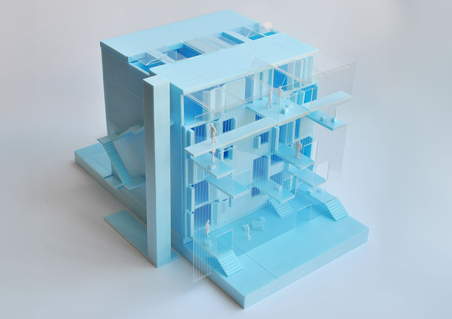 A new layer of exterior space is added to the existing buildings: each flat is provided with a generous new balcony, an extension of the interior space. These balconies are protected by a glass façade, sheltering them from the elements: a semi-exterior condition is generated, allowing for the space to be used most of the year - a collective winter garden. Neighbours animate this communal space by extending their private realms to the balconies.