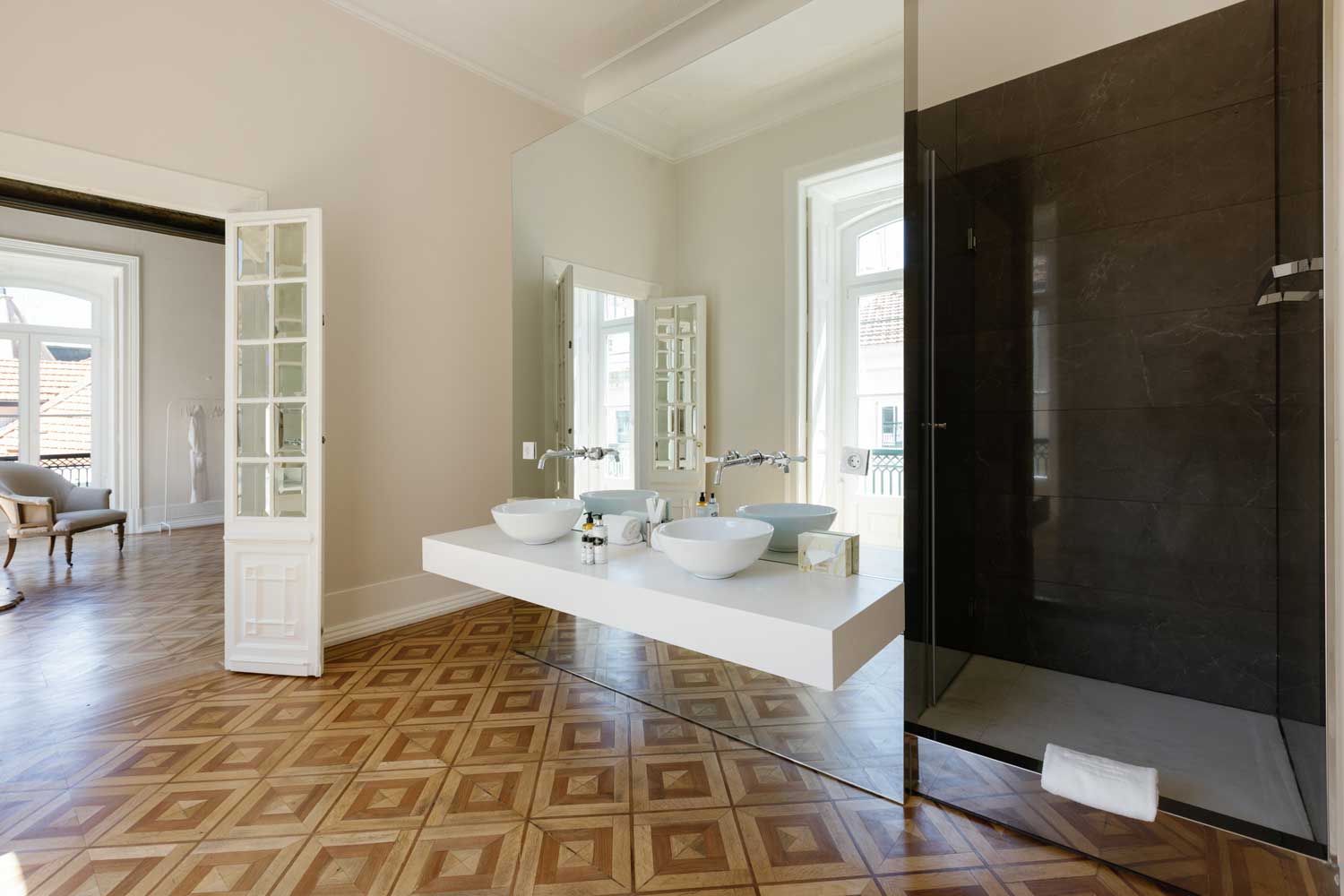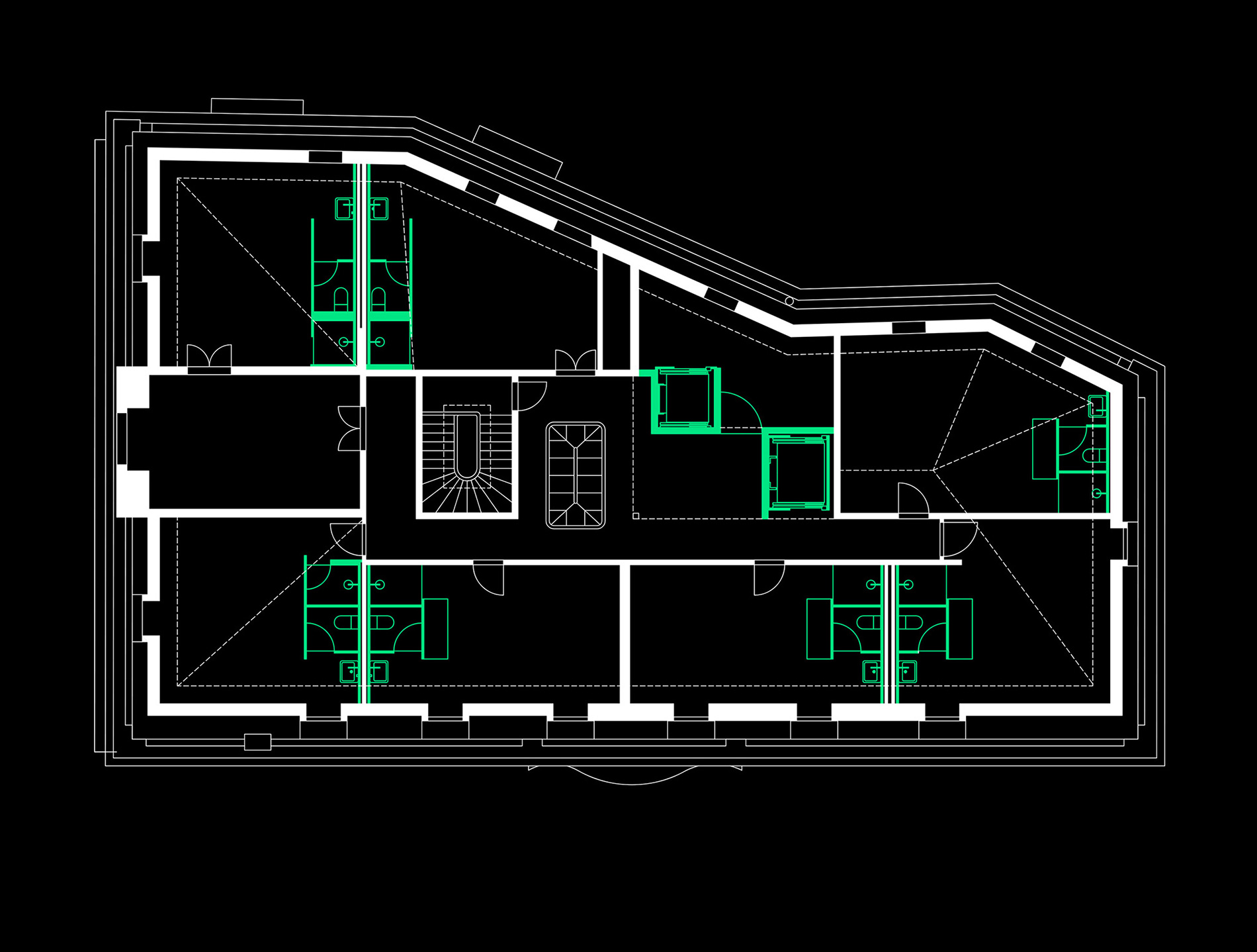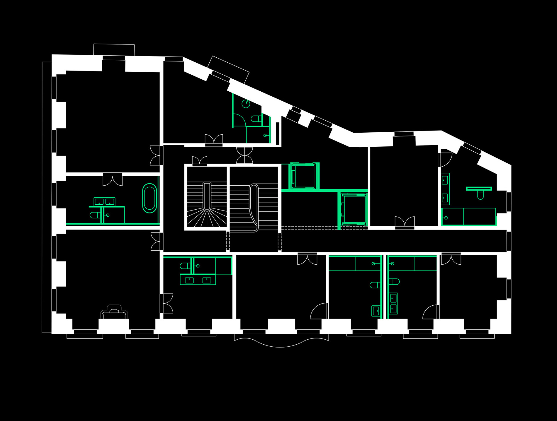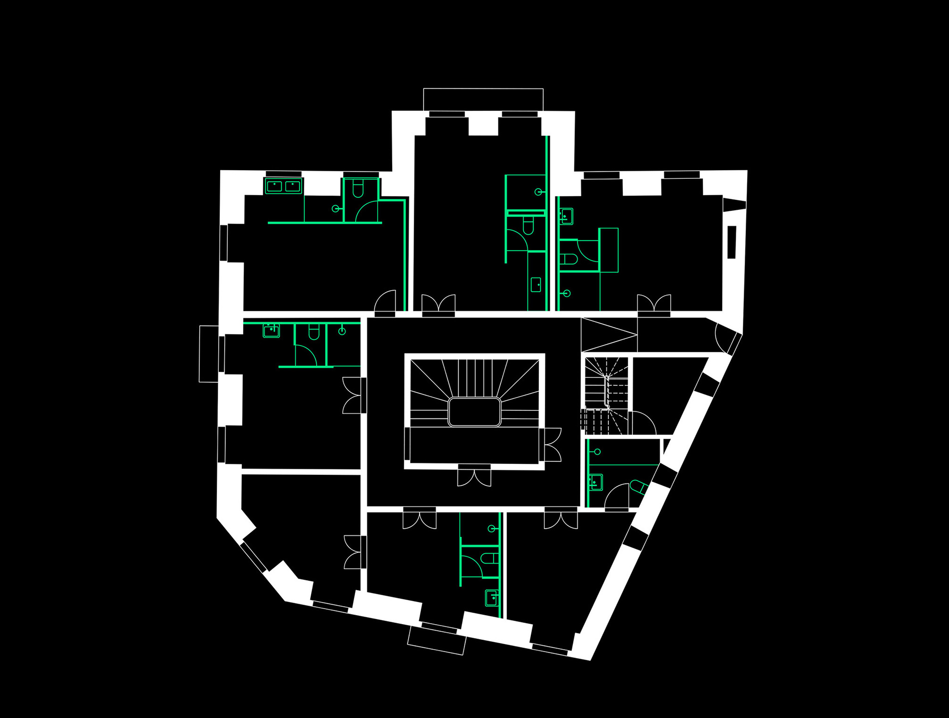 The rehabilitation of the two palaces is founded on the preservation of existing architectural structures. The adaptation of the space to its new role in tourism is done by the addition of infrastructural elements. The new elements that need adding are mostly sanitary installations, providing each room with a private unit.