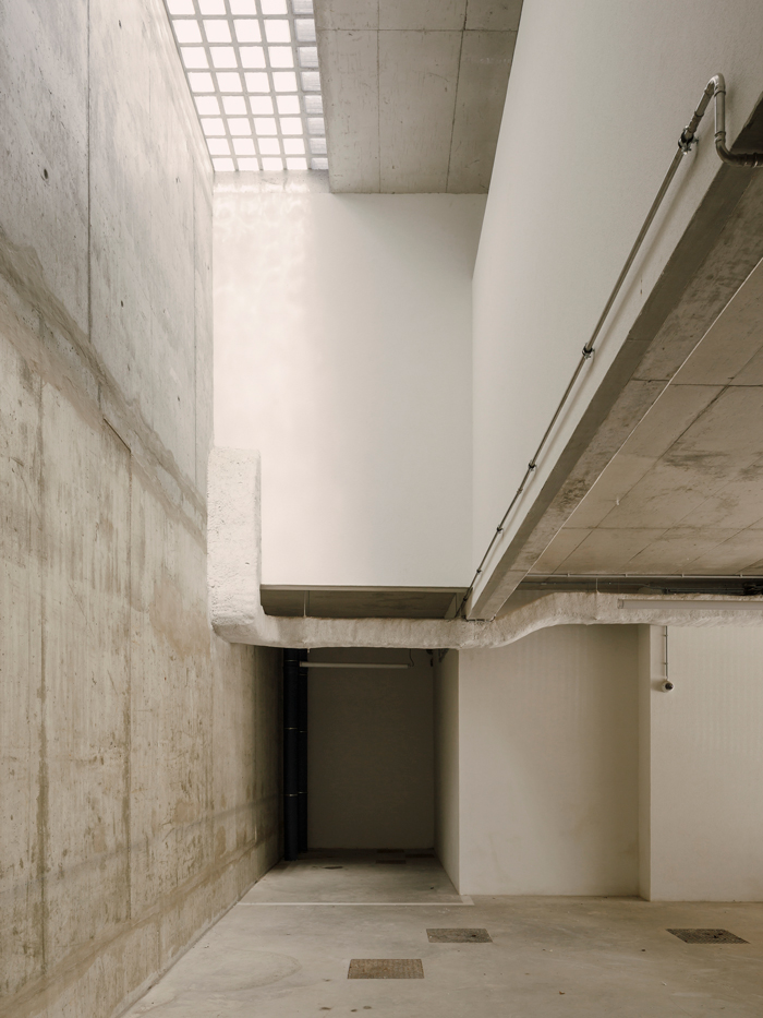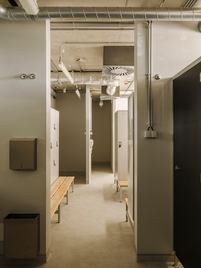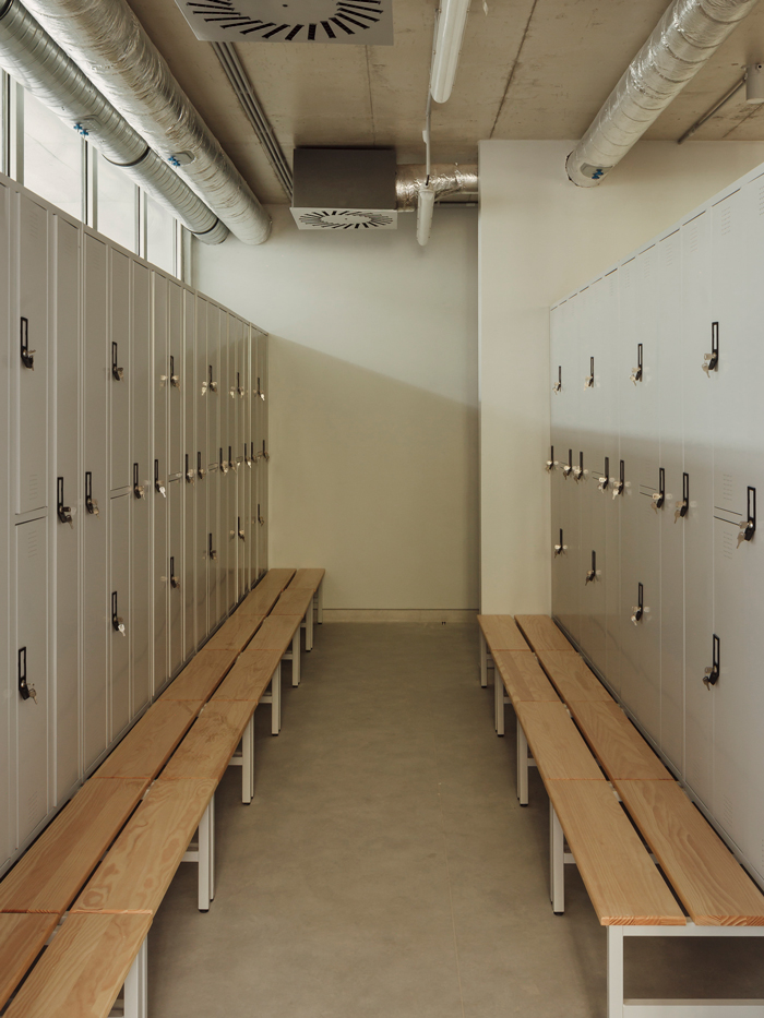 The cross section was designed so that all the spaces could enjoy natural light and ventilation despite the building being semi underground. The floor with the locker rooms - floor 1 - is set back from the facades that run lengthwise, creating puddles of light that illuminate the garage on the ground floor. The main facade distances itself from the activities that go on inside and presents itself to the urban space as an abstract plane of bricks that are exposed and perforated. This plane is spaced from the floor and top of the building permitting access to the ground floor, and an unobstructed view to the river from the top floor where the canteens and offices are located.
